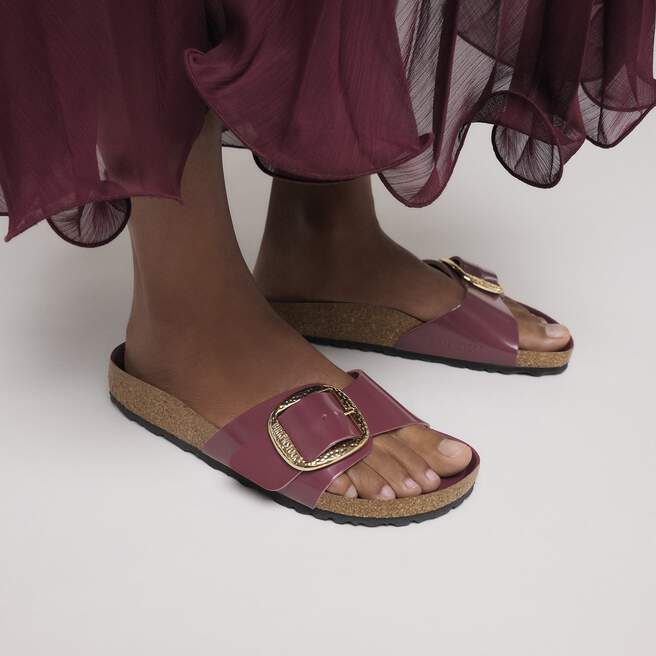 A BIRKENSTOCK Madrid a modellcsalád legrégebbi tagja, így egy igazi klasszikus. A fél évszázaddal ezelőtt „fitnesz-papucsként” bevezetett letisztult egypántos papucs már hosszú ideje divatos kísérőtárs. A Big Buckle Hammered változat megjelenése összetéveszthetetlen a nagy, elegáns csatoknak és a kézzel kalapált kialakításnak köszönhetően. Lenyűgöző és mutatós figyelemfelkeltő részlet az egyébként egyszerű papucson. A felsőrész kiváló minőségű természetes bőrből készült lakkbevonattal.